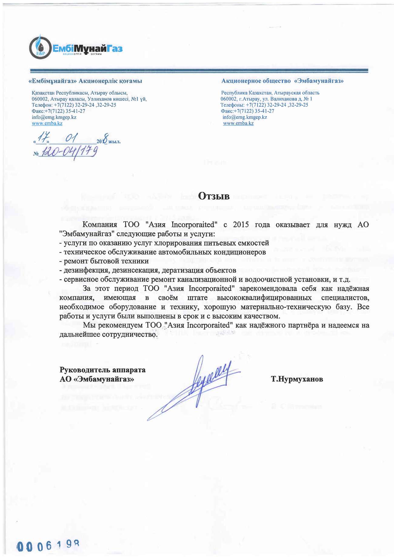 В соответствии с Законом Республики Казахстан «Об аккредитации в области оценки соответствия», Приказом ТОО «Национальный центр аккредитации», ТОО "АЗИЯ Incorporated" аккредитован на соответствие требования ГОСТ ИСО/МЭК 17025-2009 в качестве испытательной мобильной лабораторий.